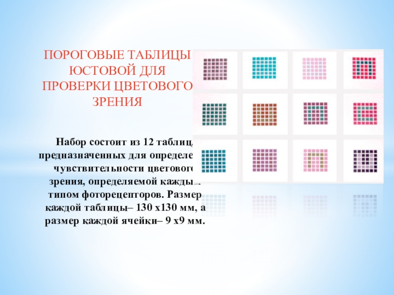 предназначенных для определения чувствительности цветового зрения, определяемой каждым типом фоторецепторов. Размер каждой таблицы– 130 х130 мм, а размер каждой ячейки– 9 х9 мм.