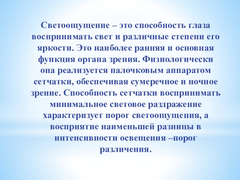 Слайд 21Светоощущение – это способность глаза воспринимать свет и различные степени его