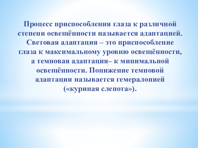 Слайд 22Процесс приспособления глаза к различной степени освещённости называется адаптацией. Световая адаптация