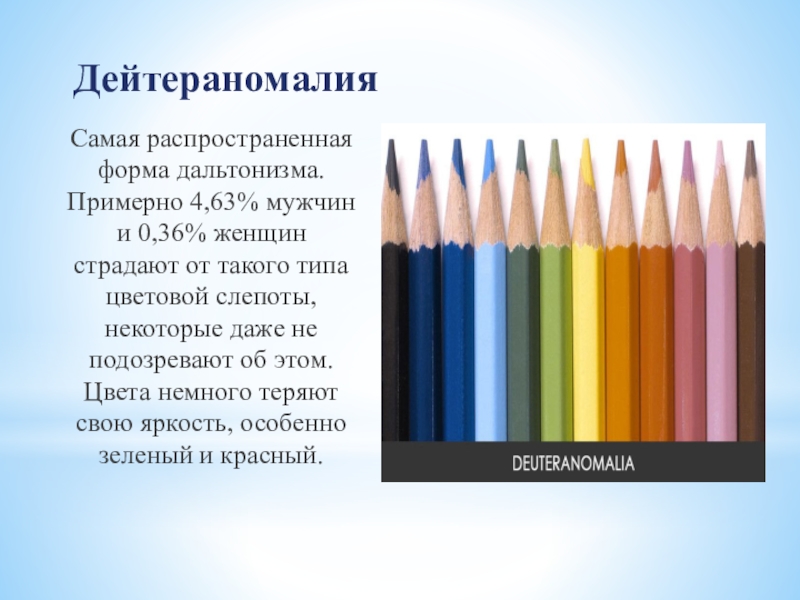 Самая распространенная форма дальтонизма. Примерно 4,63% мужчин и 0,36% женщин
