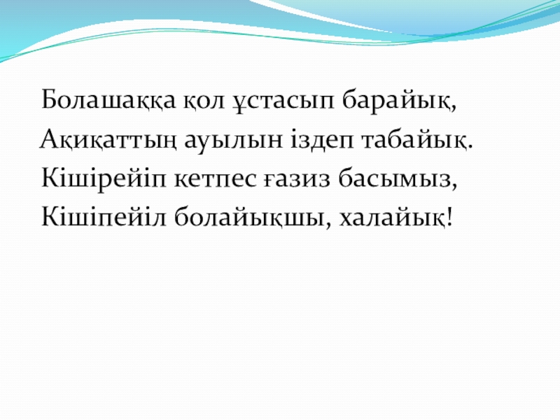 Болашаққа қол ұстасып барайық, Ақиқаттың ауылын іздеп табайық. Кішірейіп кетпес ғазиз басымыз, Кішіпейіл болайықшы, халайық!
