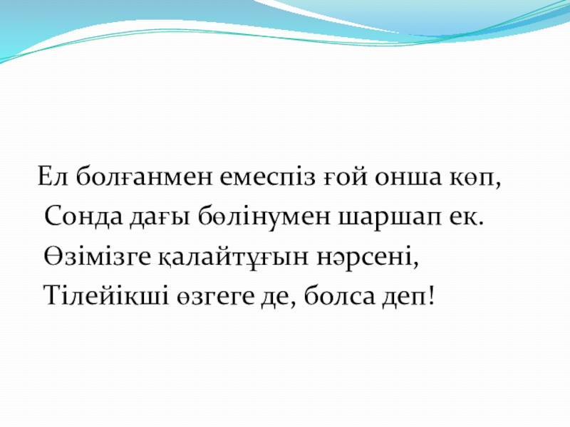 Ел болғанмен емеспіз ғой онша көп, Сонда дағы бөлінумен шаршап ек. Өзімізге қалайтұғын нәрсені, Тілейікші өзгеге де,