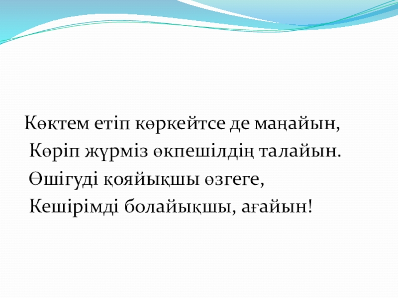 Көктем етіп көркейтсе де маңайын, Көріп жүрміз өкпешілдің талайын. Өшігуді қояйықшы өзгеге, Кешірімді болайықшы, ағайын!