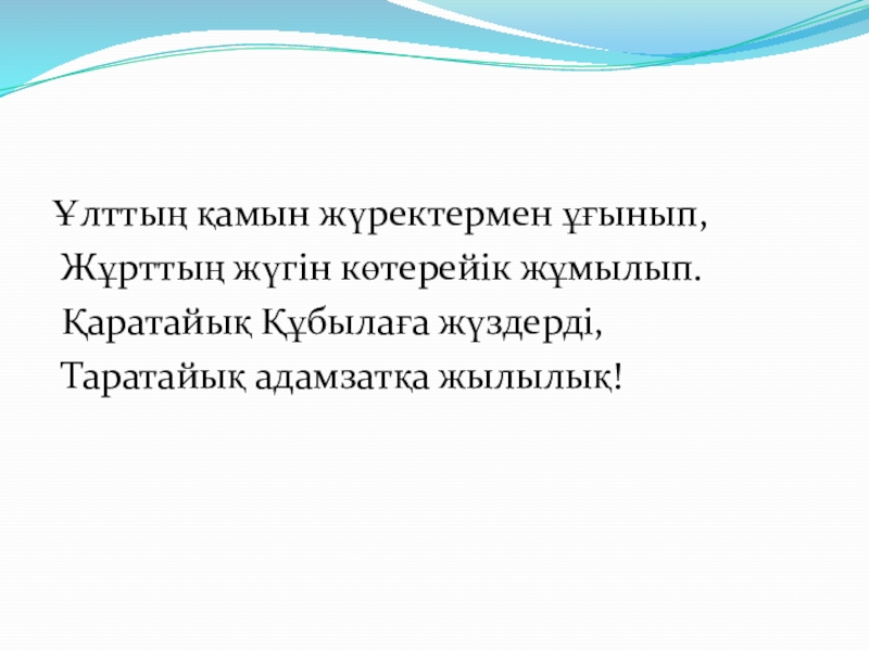 Ұлттың қамын жүректермен ұғынып, Жұрттың жүгін көтерейік жұмылып. Қаратайық Құбылаға жүздерді, Таратайық адамзатқа жылылық!