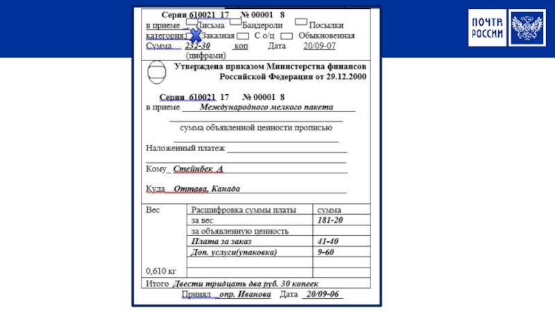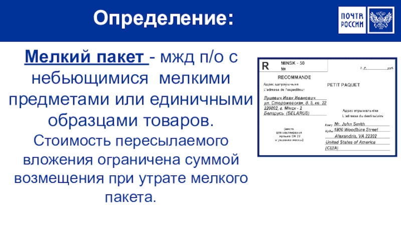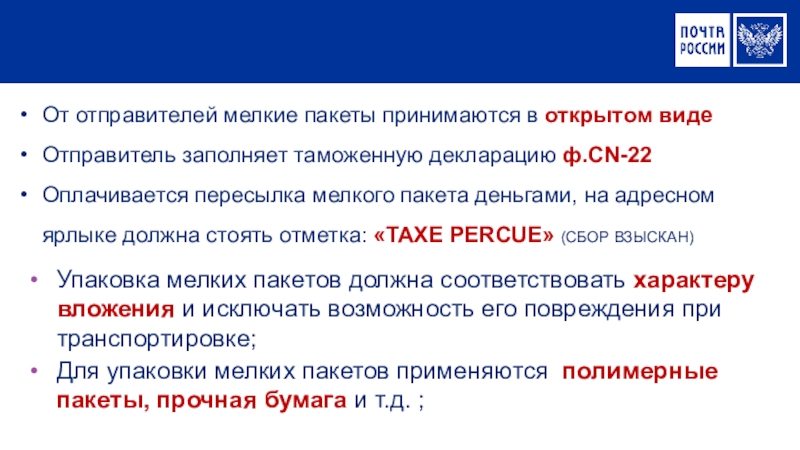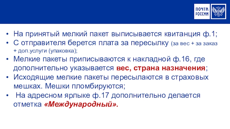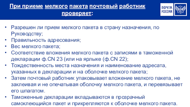 При приеме мелкого пакета почтовый работник проверяет: