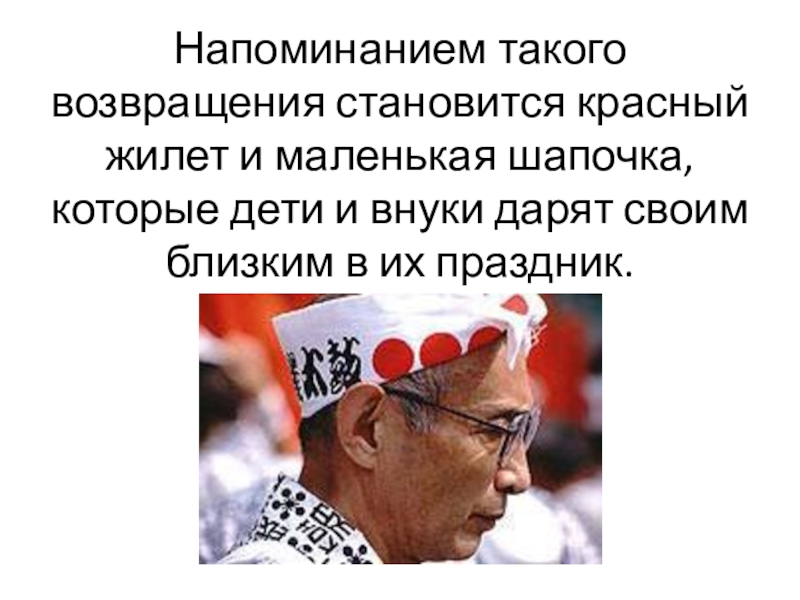 Слайд 12 Напоминанием такого возвращения становится красный жилет и маленькая шапочка, которые дети