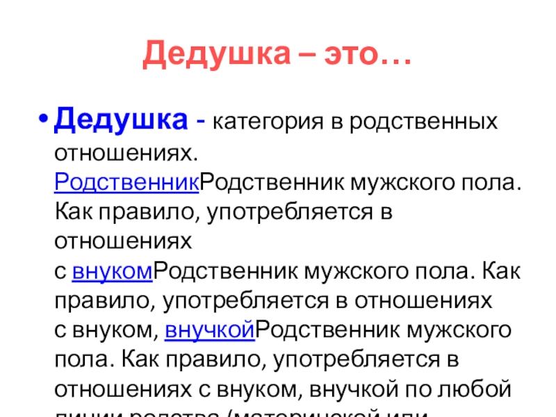 Дедушка – это…Дедушка - категория в родственных отношениях. РодственникРодственник мужского пола. Как правило, употребляется в отношениях с внукомРодственник мужского пола.
