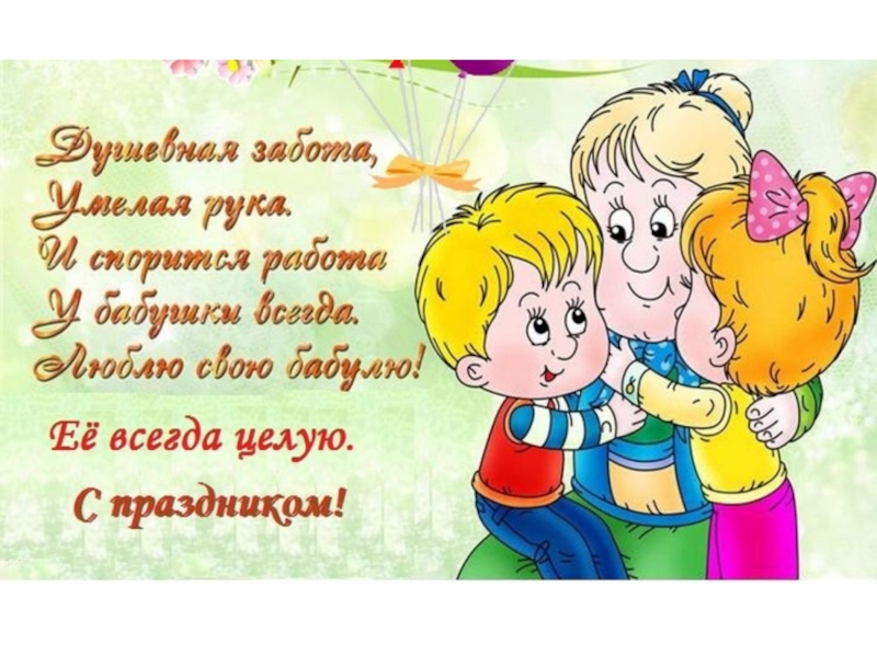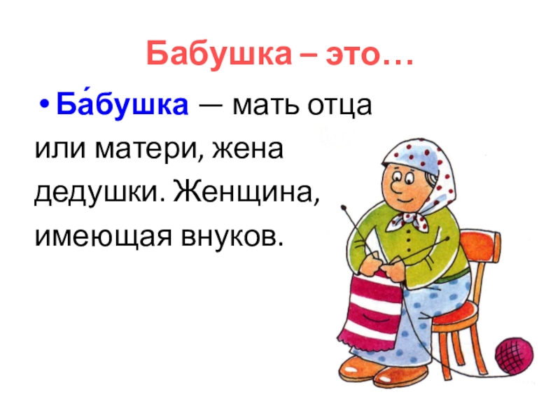Бабушка – это…Ба́бушка — мать отца или матери, жена дедушки. Женщина, имеющая внуков.