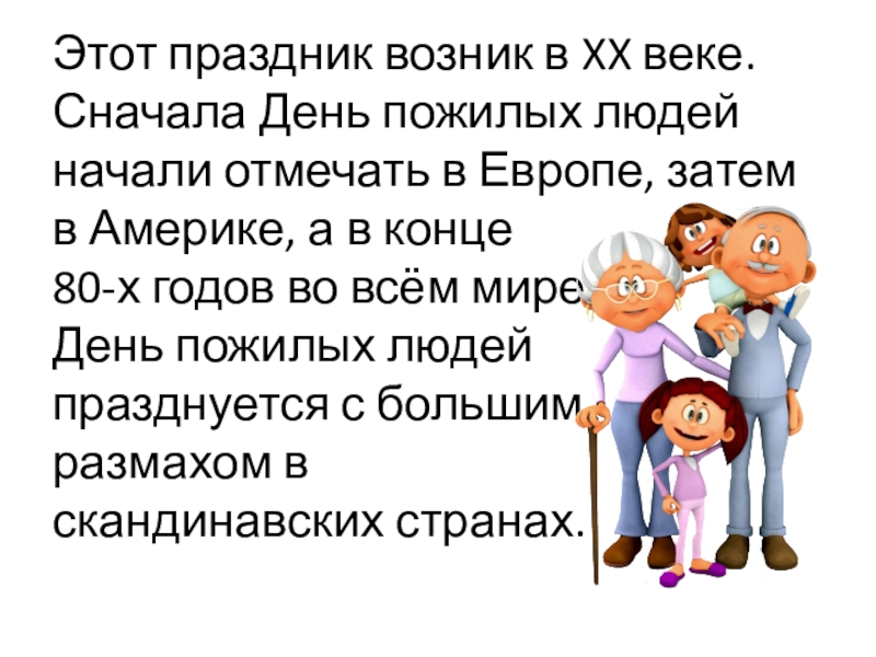 отмечать в Европе, затем в Америке, а в конце 80-х годов во всём мире. День пожилых людей празднуется с большим размахом в скандинавских странах.
