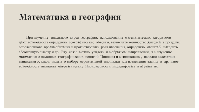 дают возможность определять географические объекты, вычислять количество жителей в пределах определенного ареала обитания и прогнозировать рост населения, определять масштаб , находить абсолютную высоту и др. Эту связь можно увидеть и в обратном направлении, т.е. изучение математики с помощью географических понятий. Циклоны и антициклоны , паводки вследствия выпадения осадков, задача о выборе строительной площадки для возведения здания и др. дают возможность выявлять математические закономерности , моделировать и изучать их.