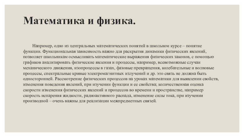 школьном курсе – понятие функции. Функциональная зависимость важно для раскрытия динамики физических явлений, позволяет школьникам осмысливать математические выражения физических законов, с помощью графиков анализировать физические явления и процессы, например, всевозможные случаи механического движения, изопроцессы в газах, фазовые превращения, колебательные и волновые процессы, спектральные кривые электромагнитных излучений и др. это связь не должна быть односторонней. Рассмотрение физических процессов на уроках математики для выявлении свойств, изменения поведения явлений, при изучении функции и ее свойства; количественная оценка скорости изменения физических явлений и процессов во времени и пространстве, например скорость испарения жидкости, радиоактивного распада, изменение силы тока, при изучении производной – очень важны для реализации межпредметных связей.