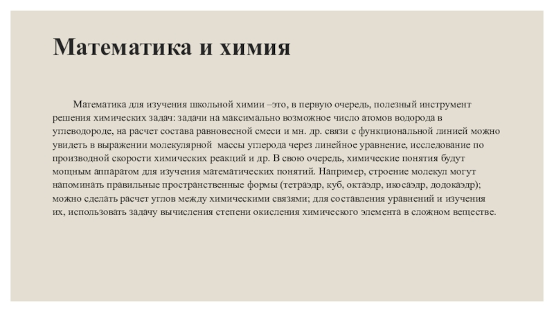 первую очередь, полезный инструмент решения химических задач: задачи на максимально возможное число атомов водорода в углеводороде, на расчет состава равновесной смеси и мн. др. связи с функциональной линией можно увидеть в выражении молекулярной массы углерода через линейное уравнение, исследование по производной скорости химических реакций и др. В свою очередь, химические понятия будут мощным аппаратом для изучения математических понятий. Например, строение молекул могут напоминать правильные пространственные формы (тетраэдр, куб, октаэдр, икосаэдр, додокаэдр); можно сделать расчет углов между химическими связями; для составления уравнений и изучения их, использовать задачу вычисления степени окисления химического элемента в сложном веществе.