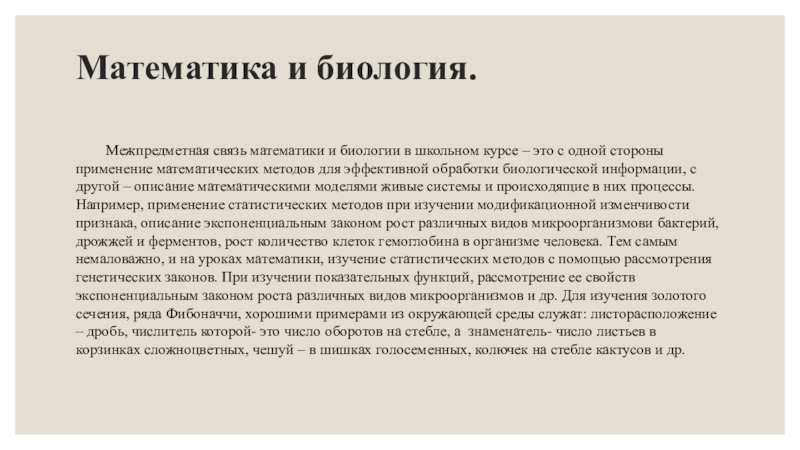 это с одной стороны применение математических методов для эффективной обработки биологической информации, с другой – описание математическими моделями живые системы и происходящие в них процессы. Например, применение статистических методов при изучении модификационной изменчивости признака, описание экспоненциальным законом рост различных видов микроорганизмови бактерий, дрожжей и ферментов, рост количество клеток гемоглобина в организме человека. Тем самым немаловажно, и на уроках математики, изучение статистических методов с помощью рассмотрения генетических законов. При изучении показательных функций, рассмотрение ее свойств экспоненциальным законом роста различных видов микроорганизмов и др. Для изучения золотого сечения, ряда Фибоначчи, хорошими примерами из окружающей среды служат: листорасположение – дробь, числитель которой- это число оборотов на стебле, а знаменатель- число листьев в корзинках сложноцветных, чешуй – в шишках голосеменных, колючек на стебле кактусов и др.