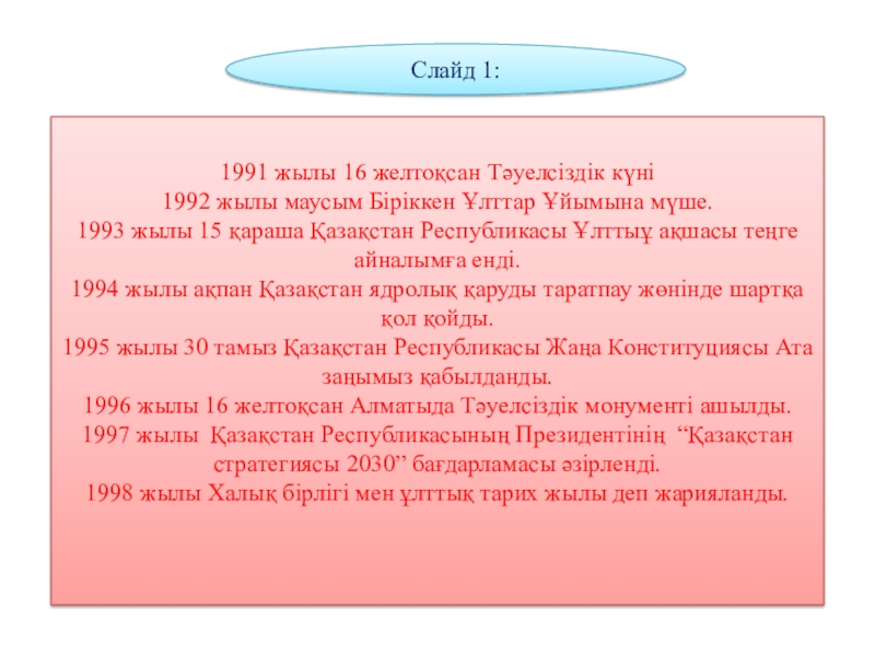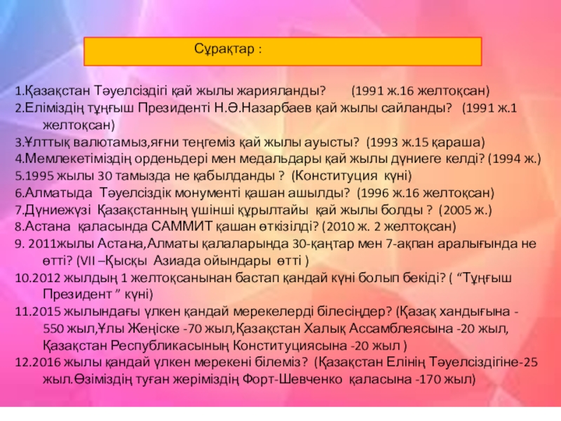 1.Қазақстан Тәуелсіздігі қай жылы жарияланды? (1991 ж.16 желтоқсан)