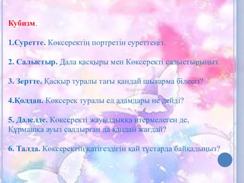 Кубизм. 1.Суретте. Көксеректің портретін суреттеңіз.2. Салыстыр. Дала қасқыры мен Көксеректі салыстырыңыз.3. Зертте. Қасқыр туралы тағы қандай шығарма