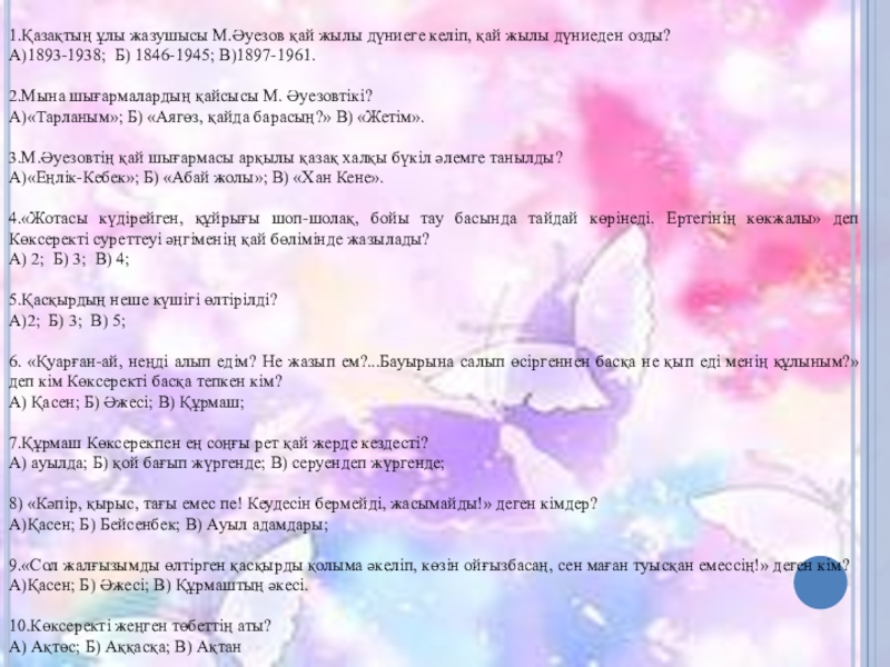 1.Қазақтың ұлы жазушысы М.Әуезов қай жылы дүниеге келіп, қай жылы дүниеден озды?А)1893-1938;  Б) 1846-1945; В)1897-1961.2.Мына шығармалардың қайсысы