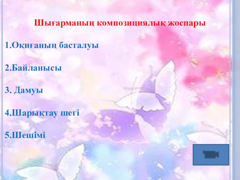 Шығарманың композициялық жоспарыОқиғаның басталуыБайланысы Дамуы Шарықтау шегі Шешімі