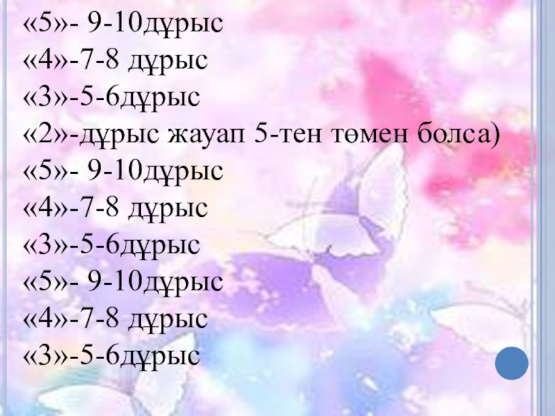 «5»- 9-10дұрыс«4»-7-8 дұрыс«3»-5-6дұрыс«2»-дұрыс жауап 5-тен төмен болса)«5»- 9-10дұрыс«4»-7-8 дұрыс«3»-5-6дұрыс«5»- 9-10дұрыс«4»-7-8 дұрыс«3»-5-6дұрыс