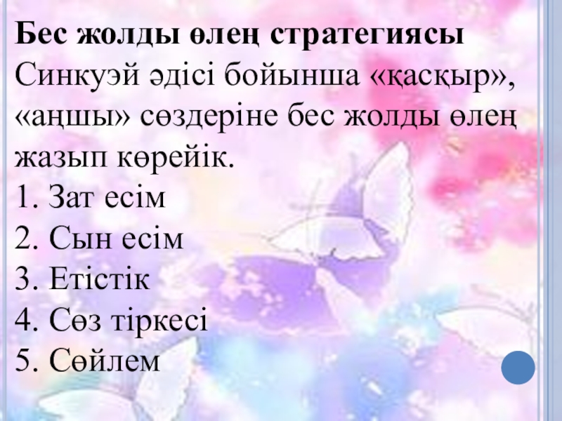 Бес жолды өлең стратегиясы Синкуэй әдісі бойынша «қасқыр», «аңшы» сөздеріне бес жолды өлең жазып көрейік. 1. Зат