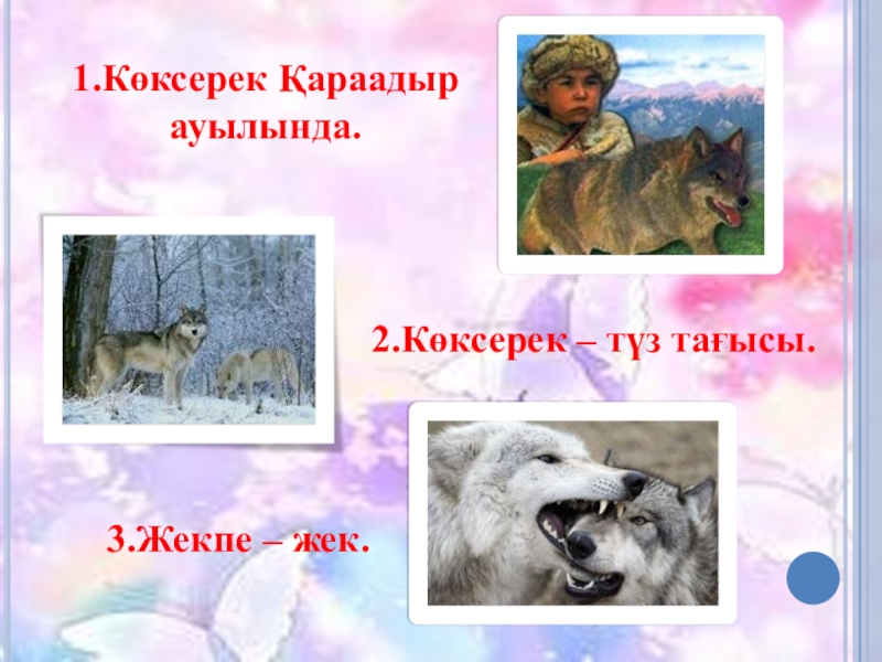 1.Көксерек Қараадыр ауылында.3.Жекпе – жек.2.Көксерек – түз тағысы.
