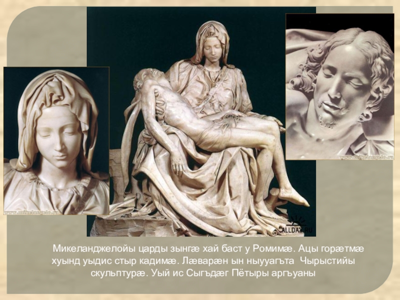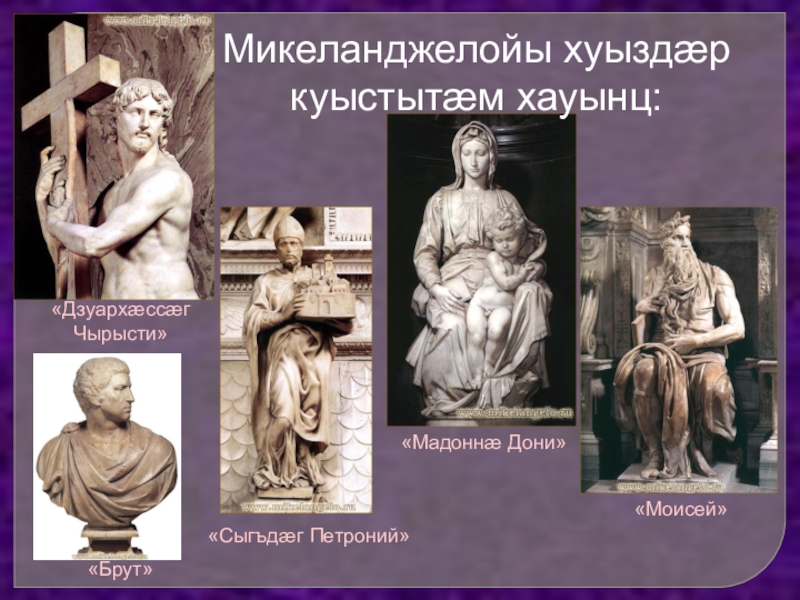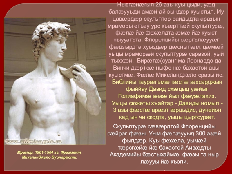 Библийы таурæгъмæ гæсгæ æхсарджын фыййау Давид схæцыд уæйыг Голиафимæ æмæ йыл фæуæлахиз. Уыцы сюжеты хъайтар - Давиды номыл - 3 азы фæстæ арæзт æрцыдис, дунейон кад ын чи скодта, уыцы цыртсурæт.