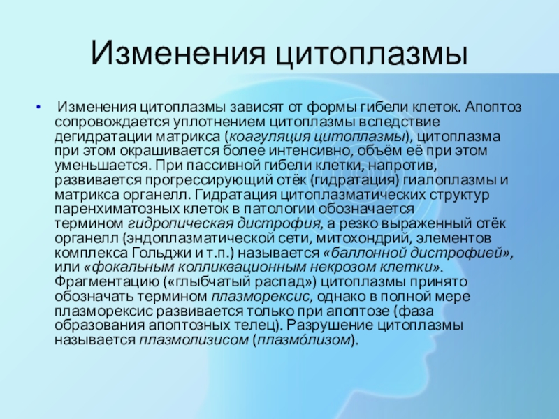 цитоплазмы вследствие дегидратации матрикса (коагуляция цитоплазмы), цитоплазма при этом окрашивается более интенсивно, объём её при этом уменьшается. При пассивной гибели клетки, напротив, развивается прогрессирующий отёк (гидратация) гиалоплазмы и матрикса органелл. Гидратация цитоплазматических структур паренхиматозных клеток в патологии обозначается термином гидропическая дистрофия, а резко выраженный отёк органелл (эндоплазматической сети, митохондрий, элементов комплекса Гольджи и т.п.) называется «баллонной дистрофией», или «фокальным колликвационным некрозом клетки». Фрагментацию («глыбчатый распад») цитоплазмы принято обозначать термином плазморексис, однако в полной мере плазморексис развивается только при апоптозе (фаза образования апоптозных телец). Разрушение цитоплазмы называется плазмолизисом (плазмόлизом).