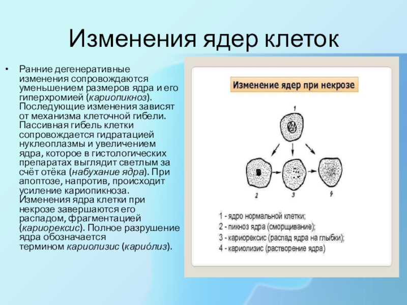 Изменения ядер клетокРанние дегенеративные изменения сопровождаются уменьшением размеров ядра и его гиперхромией (кариопикноз). Последующие изменения зависят от