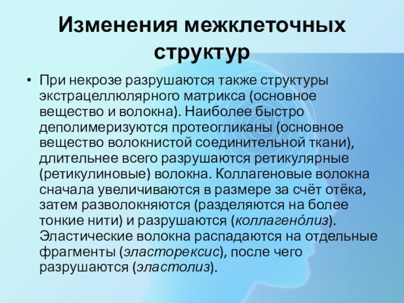 Изменения межклеточных структурПри некрозе разрушаются также структуры экстрацеллюлярного матрикса (основное вещество и волокна). Наиболее быстро деполимеризуются протеогликаны