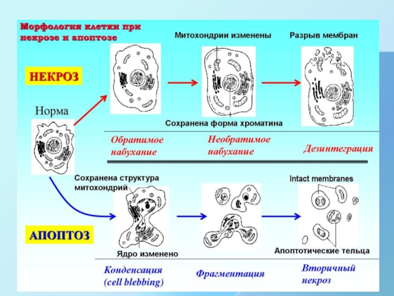 Изменения цитоплазмы зависят от формы гибели клеток. Апоптоз сопровождается уплотнением