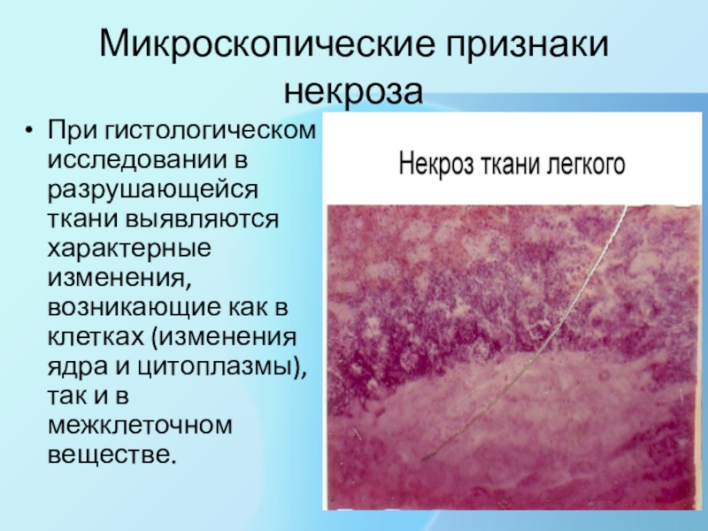 Микроскопические признаки некрозаПри гистологическом исследовании в разрушающейся ткани выявляются характерные изменения, возникающие как в клетках (изменения ядра и цитоплазмы), так и в межклеточном веществе.