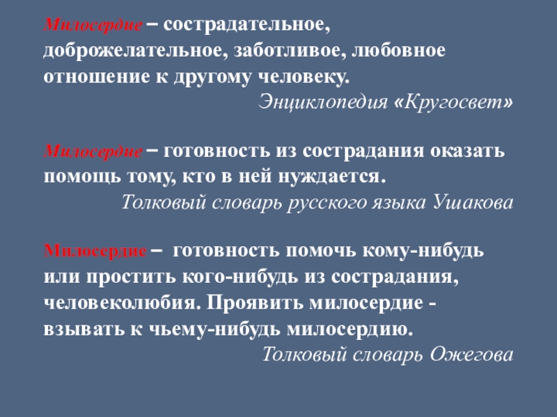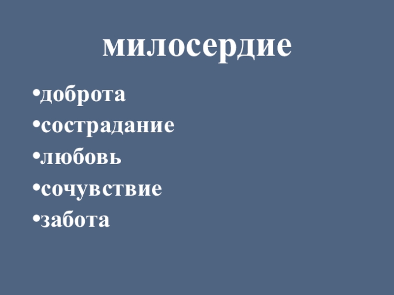 Слайд 4Милосердие – сострадательное, доброжелательное, заботливое, любовное отношение к другому человеку.