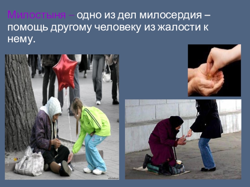Слайд 13Милостыня – одно из дел милосердия – помощь другому человеку из