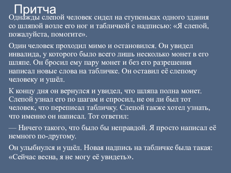 ПритчаОднажды слепой человек сидел на ступеньках одного здания со шляпой возле его ног и табличкой с надписью: «Я слепой, пожалуйста, помогите».Один человек проходил мимо и остановился. Он увидел инвалида, у которого было всего лишь несколько монет