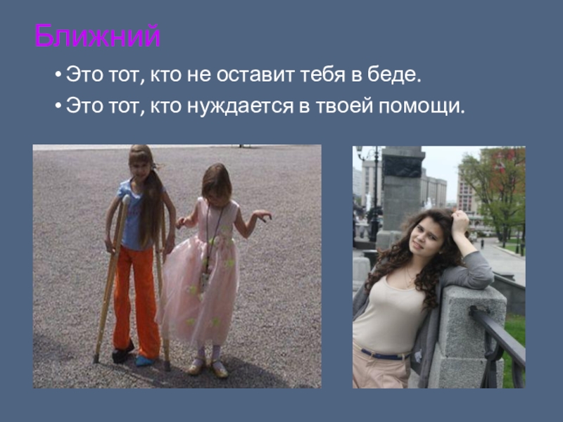 БлижнийЭто тот, кто не оставит тебя в беде.Это тот, кто нуждается в твоей помощи.