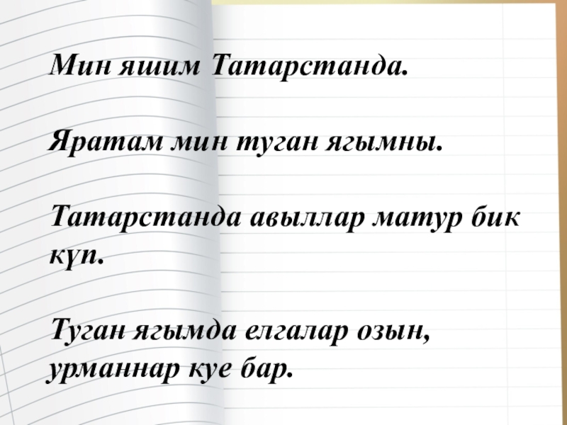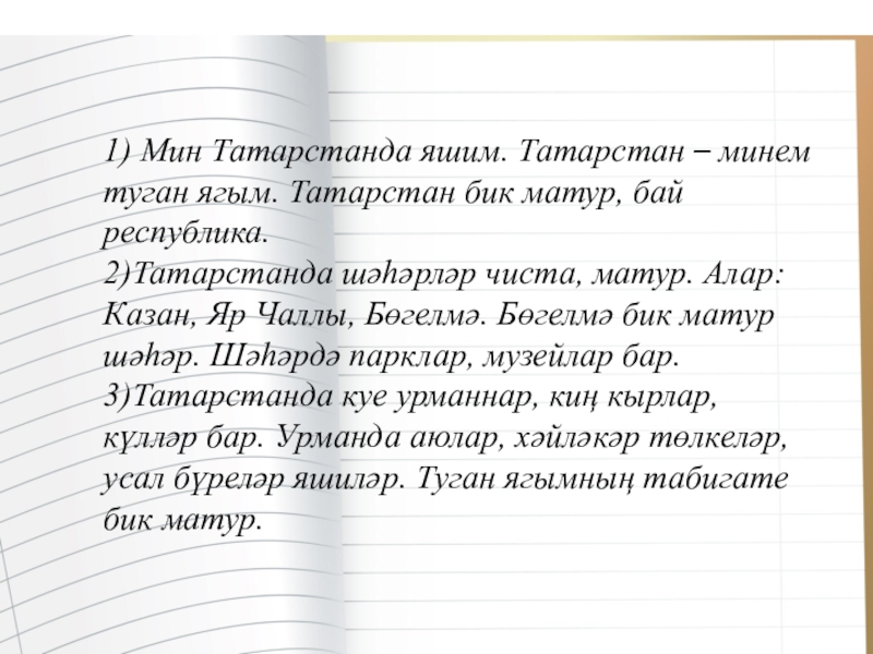 Слайд 61) Мин Татарстанда яшим. Татарстан – минем туган ягым. Татарстан бик