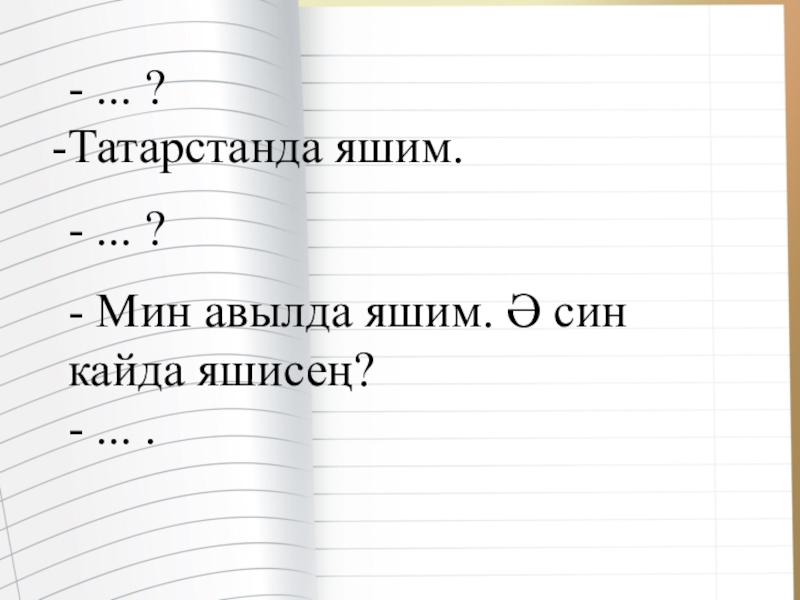 - ... ?Татарстанда яшим.- ... ?- Мин авылда яшим. Ә син кайда яшисең?- ... .