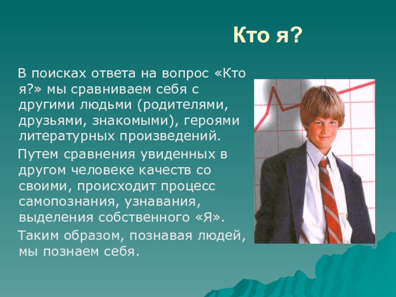 В поисках ответа на вопрос «Кто я?» мы сравниваем себя с другими людьми (родителями, друзьями, знакомыми), героями литературных произведений.