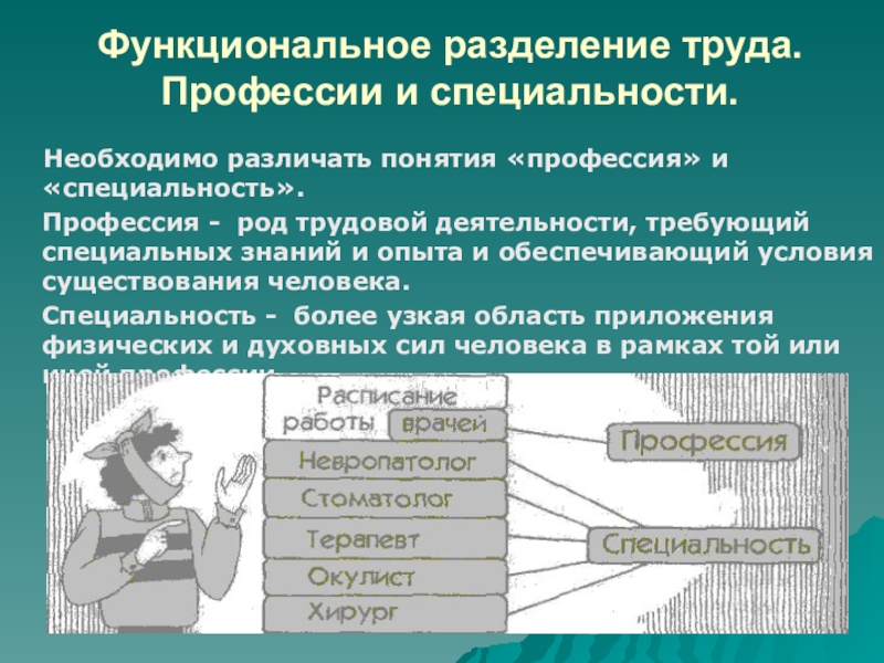 Слайд 9Функциональное разделение труда. Профессии и специальности.