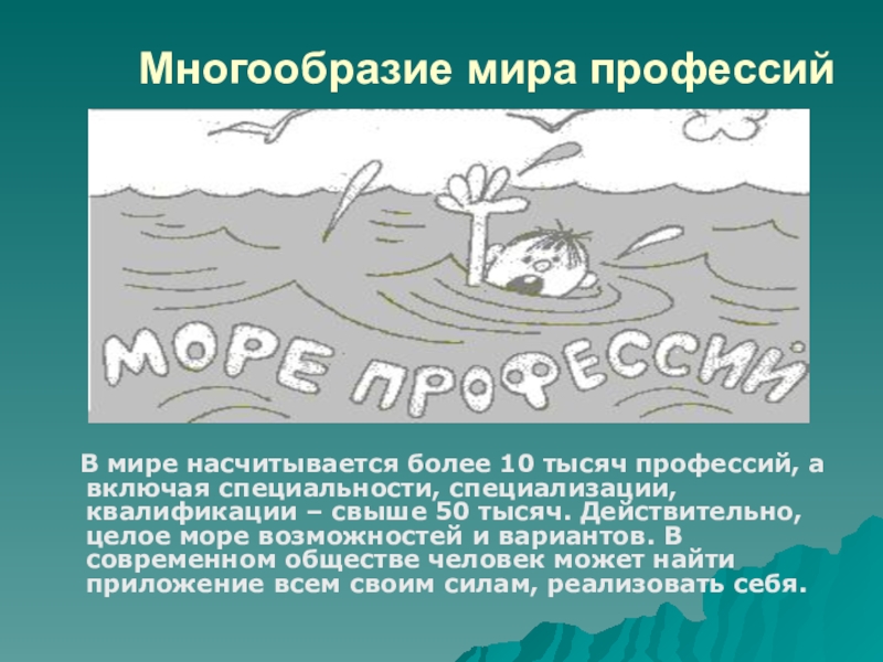 более 10 тысяч профессий, а включая специальности, специализации, квалификации – свыше 50 тысяч. Действительно, целое море возможностей и вариантов. В современном обществе человек может найти приложение всем своим силам, реализовать себя.