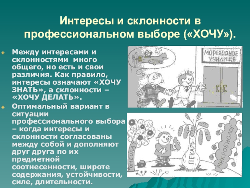Слайд 5Интересы и склонности в профессиональном выборе («ХОЧУ»).