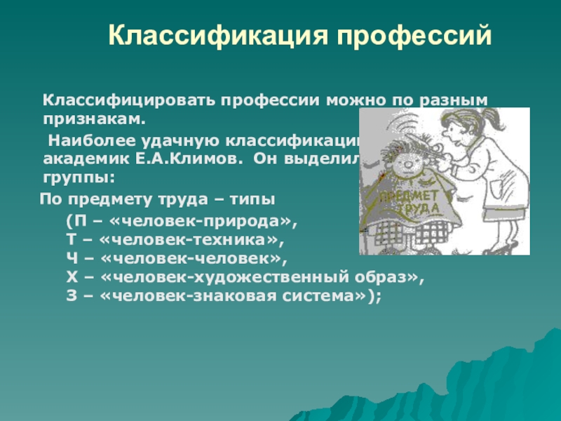 Наиболее удачную классификацию предложил академик Е.А.Климов. Он выделил следующие 4 группы: