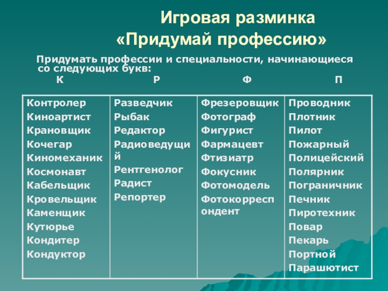 Придумать профессии и специальности, начинающиеся со следующих букв: