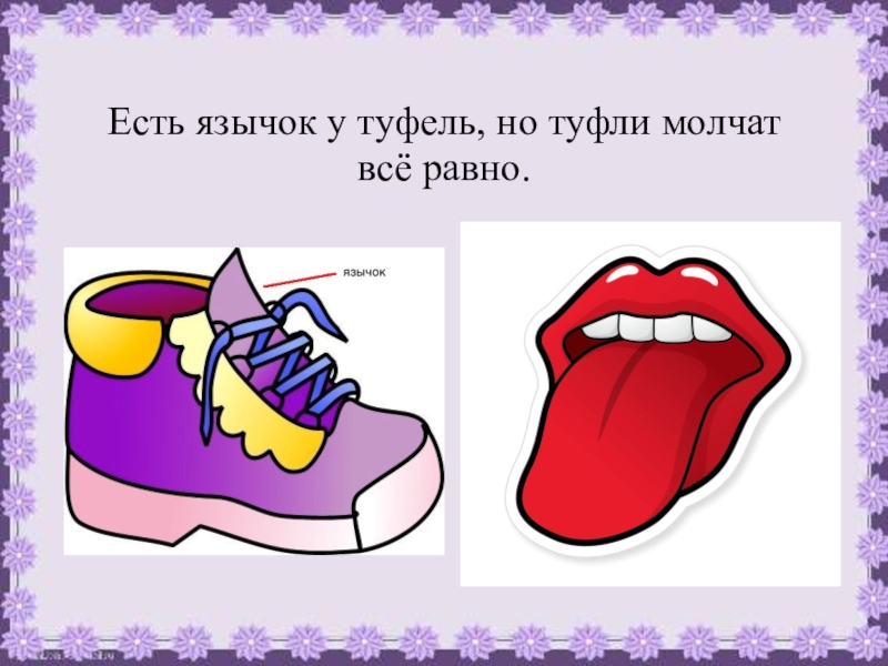 Слайд 5Есть язычок у туфель, но туфли молчат всё равно.
