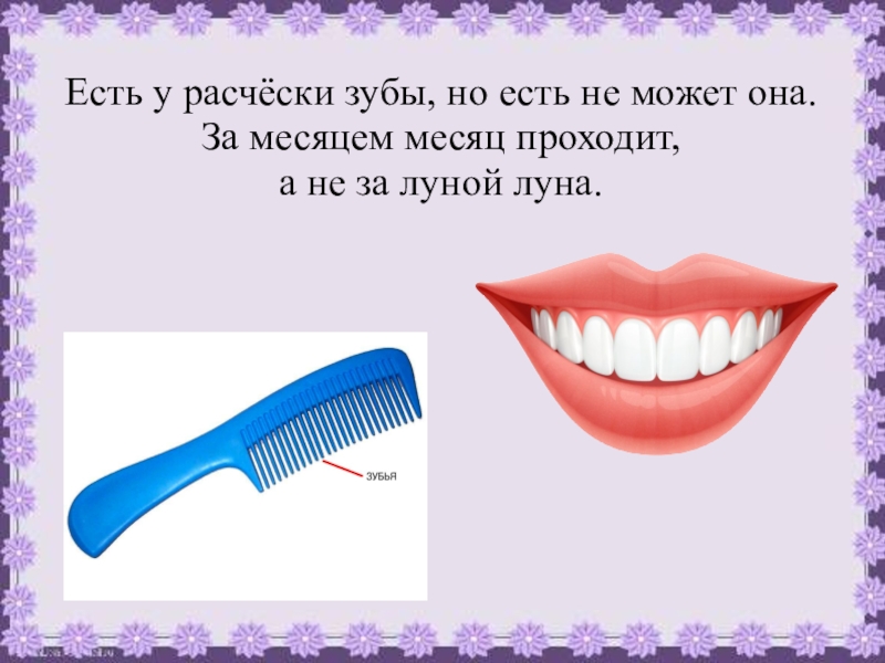 Есть у расчёски зубы, но есть не может она.За месяцем месяц проходит, а не за луной луна.