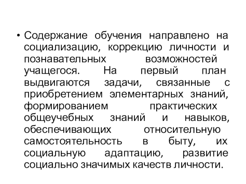 Слайд 27Содержание обучения направлено на социализацию, коррекцию личности и познавательных возможностей учащегося.