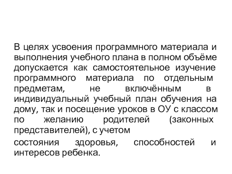объёме допускается как самостоятельное изучение программного материала по отдельным предметам, не включённым в индивидуальный учебный план обучения на дому, так и посещение уроков в ОУ с классом по желанию родителей (законных представителей), с учетом
