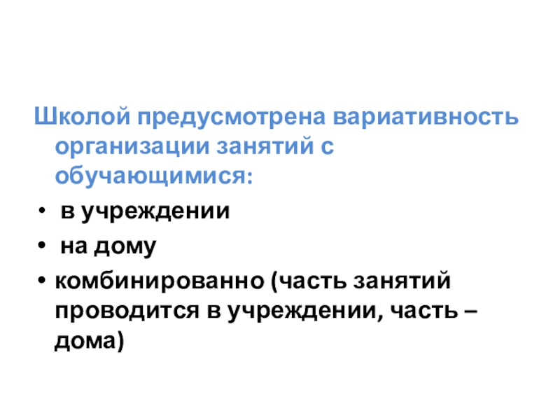 Слайд 20Школой предусмотрена вариативность организации занятий с обучающимися: