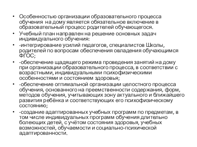 Слайд 22Особенностью организации образовательного процесса обучения на дому является обязательное включение в