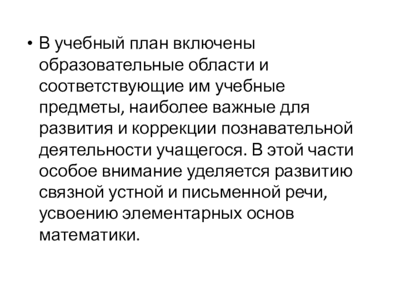 наиболее важные для развития и коррекции познавательной деятельности учащегося. В этой части особое внимание уделяется развитию связной устной и письменной речи, усвоению элементарных основ математики.