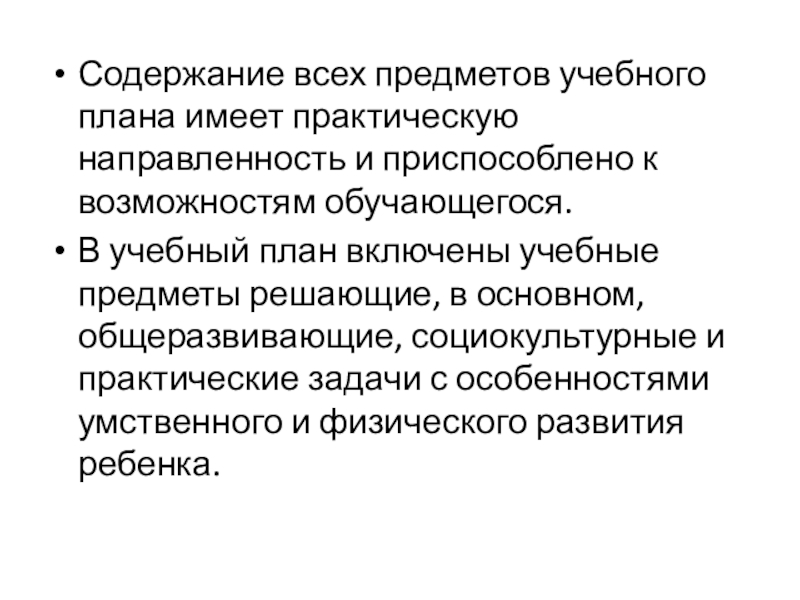 Слайд 23Содержание всех предметов учебного плана имеет практическую направленность и приспособлено к